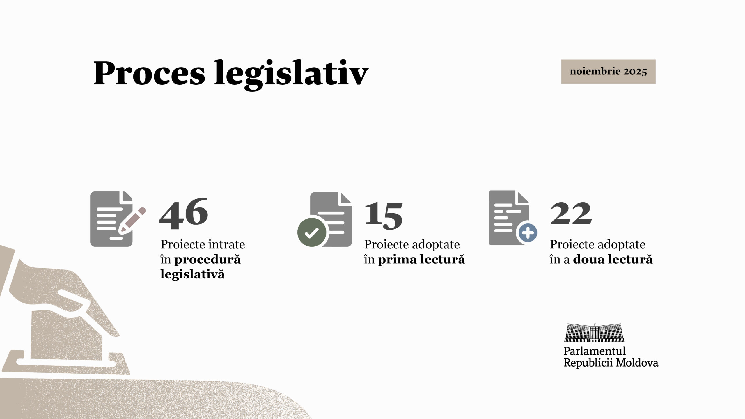 În luna noiembrie, Parlamentul s-a întrunit în trei ședințe plenare. În cadrul acestora, deputații au adoptat 22 de acte normative. Este vorba despre 6 legi și 16 hotărâri.