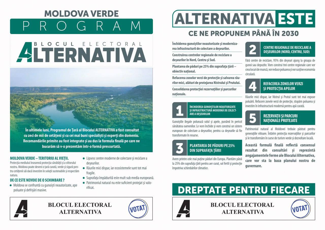 Blocul Electoral ALTERNATIVA a prezentat astăzi, 17 septembrie, programul ”Moldova Verde – teritoriu al vieții”. Ana-Maria Păunescu, unul dintre candidații la funcția de deputat, a anunțat că ALTERNATIVA propune un plan concret pentru a transforma Republica Moldova într-o țară curată, sănătoasă și prietenoasă cu natura.
