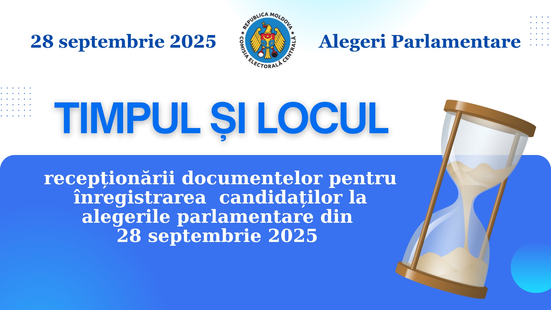 Comisia Electorală Centrală (CEC), în cadrul ședinței de astăzi, a stabilit locul și timpul recepționării documentelor pentru înregistrarea candidaților la funcția de deputat în Parlamentul Republicii Moldova.