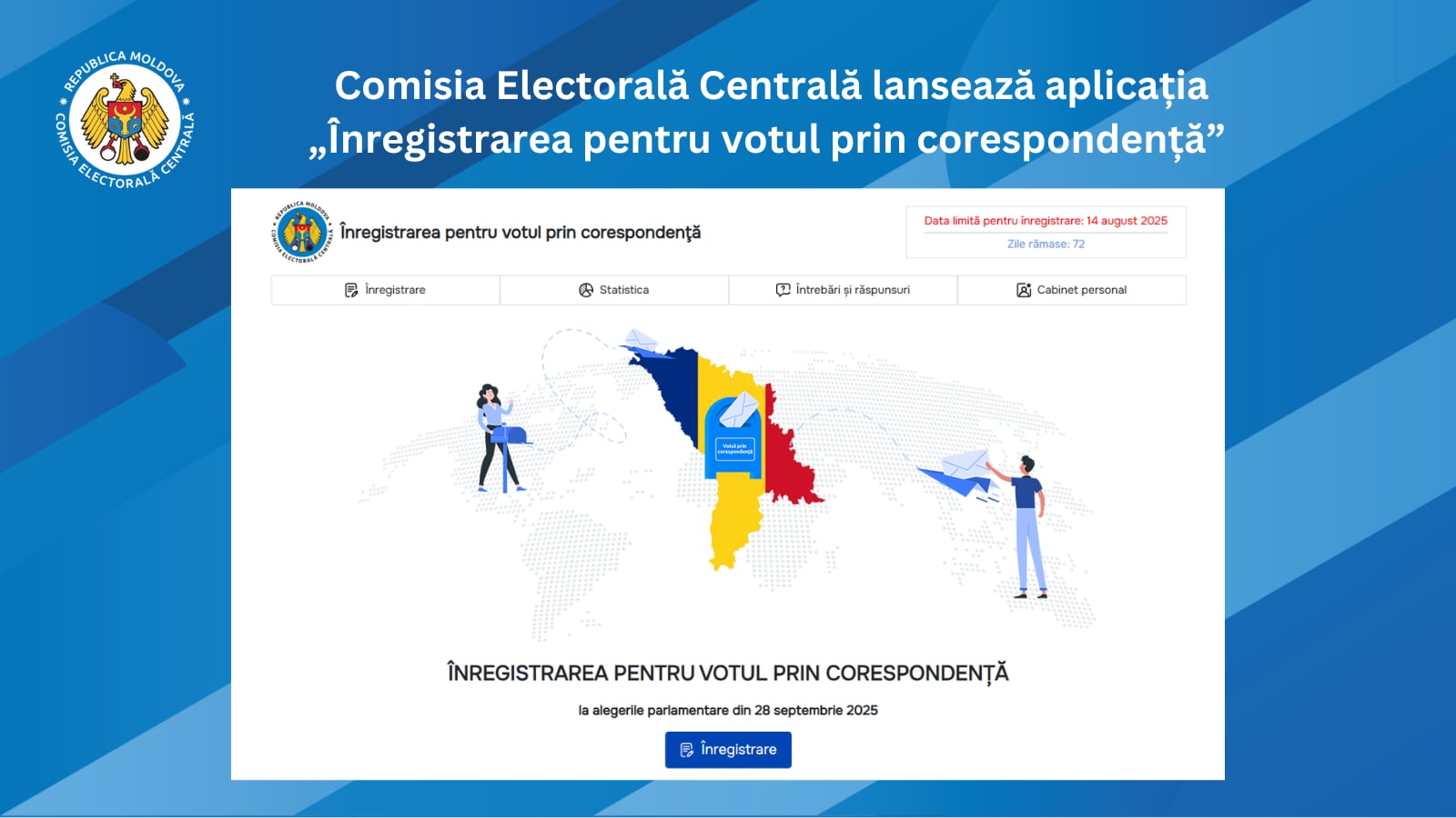 Începând de astăzi, cetățenii Republicii Moldova cu drept de vot care, în perioada votării, se vor afla pe teritoriul Statelor Unite ale Americii, Canadei, Regatului Norvegiei, Regatului Suediei, Republicii Finlanda, Islandei, Japoniei, Republicii Coreea, Uniunii Australiei, Noii Zeelandei, se pot înregistra pentru a vota prin corespondență la alegerile parlamentare din 28 septembrie 2025.