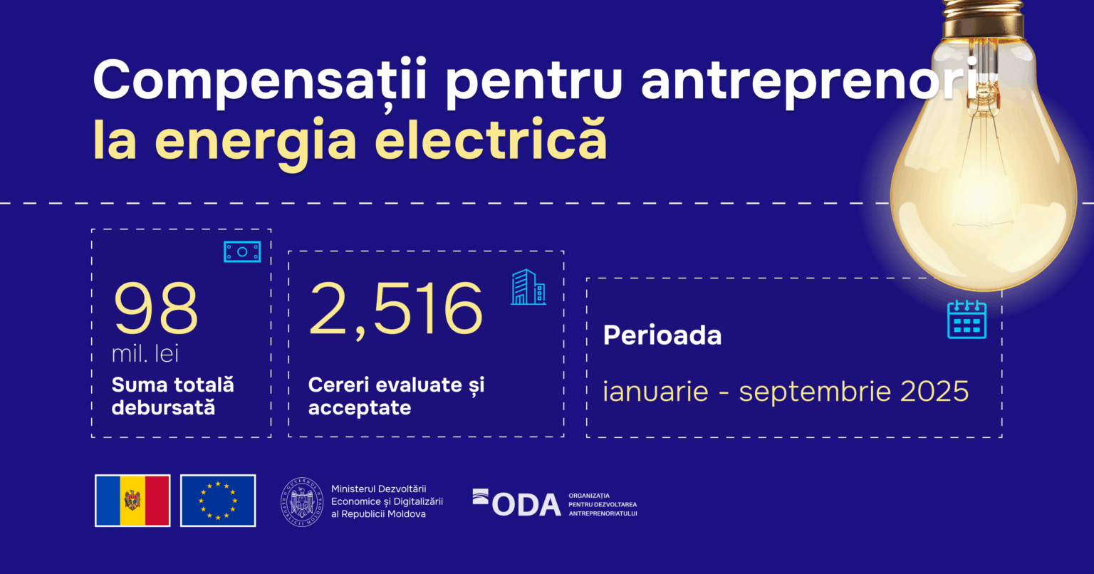 Valoarea compensațiilor pentru energia electrică acordate antreprenorilor de Organizația pentru Dezvoltarea Antreprenoriatului a ajuns la 98 milioane de lei în perioada ianuarie – august 2025. Acest suport face parte din Programul de compensare lansat de Guvernul Republicii Moldova, cu sprijinul financiar al Uniunii Europene.