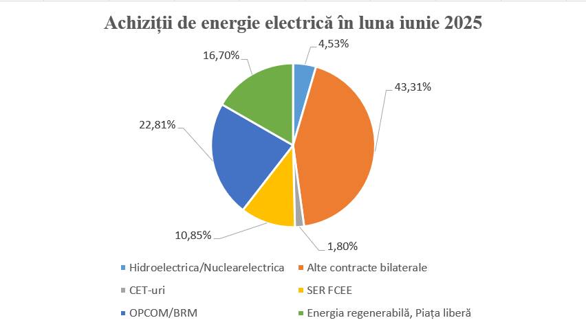 În luna iunie, SA Energocom a achiziționat aproximativ 301 mii MWh de energie electrică, provenită atât din surse interne, cât și din importuri, la un preț mediu ponderat de 109,92 EUR/MWh. Cea mai mare parte a volumului – 70,65% – a fost acoperită prin importuri, în timp ce producătorii autohtoni au furnizat 29,35%.