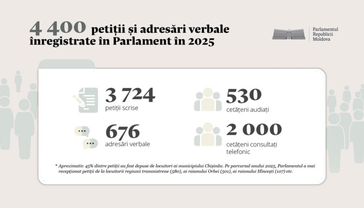 Pe parcursul anului 2025, Parlamentul a recepționat 4 400 de petiții și adresări verbale. Cetățenii au semnalat aproape 6 400 de chestiuni, iar 85% dintre petiții au fost depuse în formă scrisă. Totodată, au fost recepționate 676 de adresări verbale.