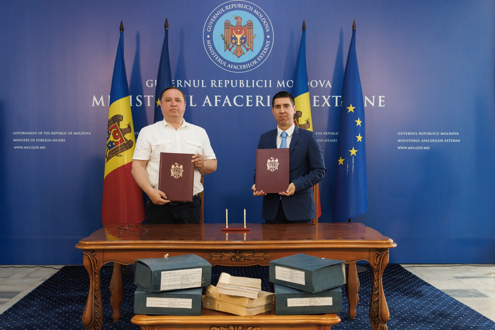 Viceprim-ministrul, ministrul afacerilor externe, Mihai Popșoi, și directorul Agenției Naționale a Arhivelor, Igor Cașu, au semnat, astăzi, procesul-verbal de predare-primire a 43 de dosare arhivistice din perioada 1955–1991.
