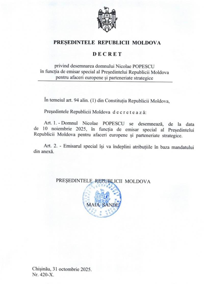 Președinta Republicii Moldova, Maia Sandu, a semnat decretul privind numirea domnului Nicu Popescu în funcția de emisar special pentru afaceri europene și parteneriate strategice.