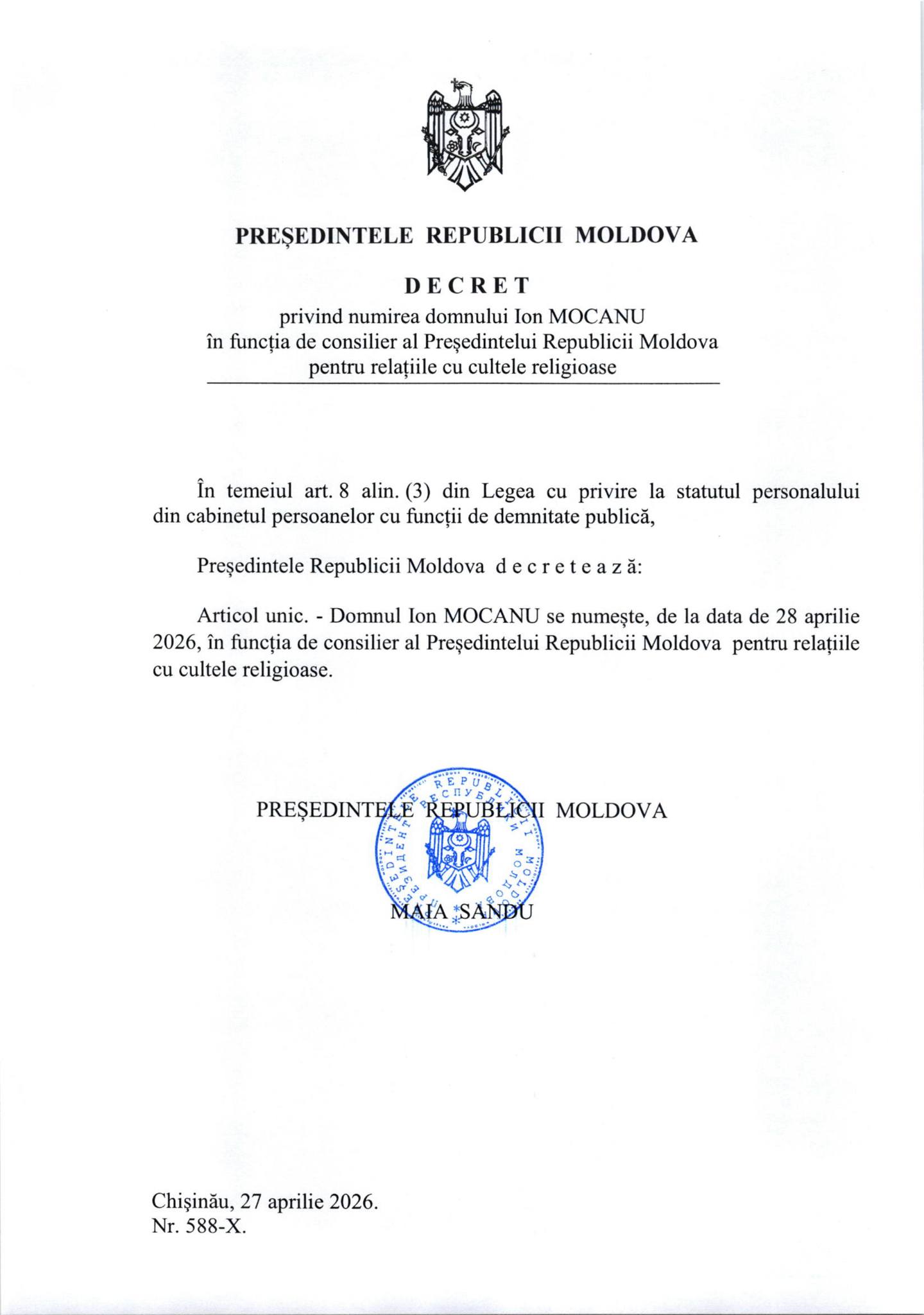 Președinta Republicii Moldova, Maia Sandu, a semnat decretul privind numirea domnului Ion Mocanu în funcția de consilier prezidențial pentru relațiile cu cultele religioase.