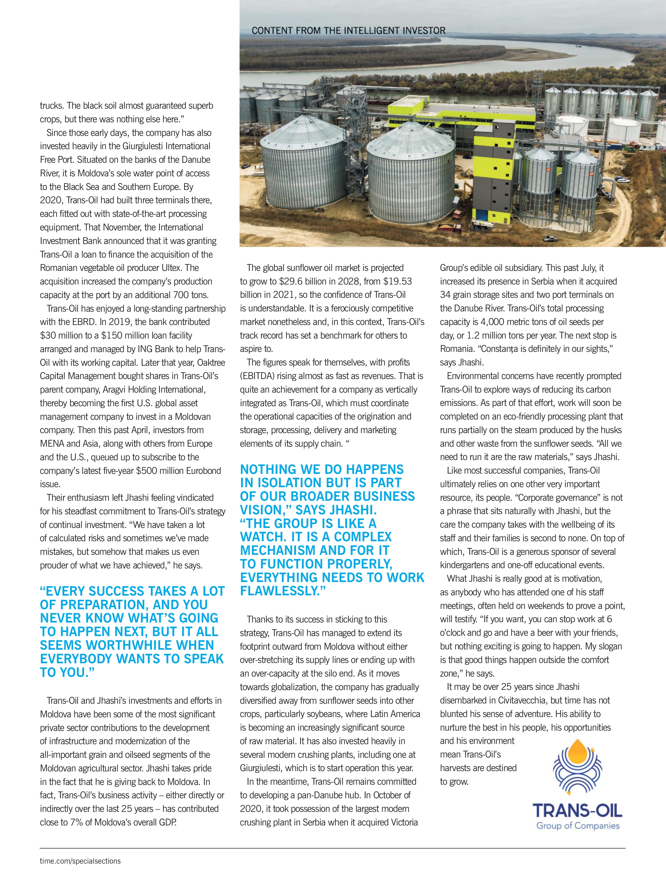«Инвестиции и усилия, предпринятые Trans-Oil и Джаши в Молдове, связаны с одним из наиболее значительных вкладов частного сектора в развитие инфраструктуры и модернизацию всех сегментов зерновых и масличных культур в сельскохозяйственном секторе страны. Джаши гордится тем, что предлагает Молдове. Фактически деловая активность Trans-Oil — прямо или косвенно — состоит из вклада почти в 7% ВВП Молдовы», — говорится в материале.