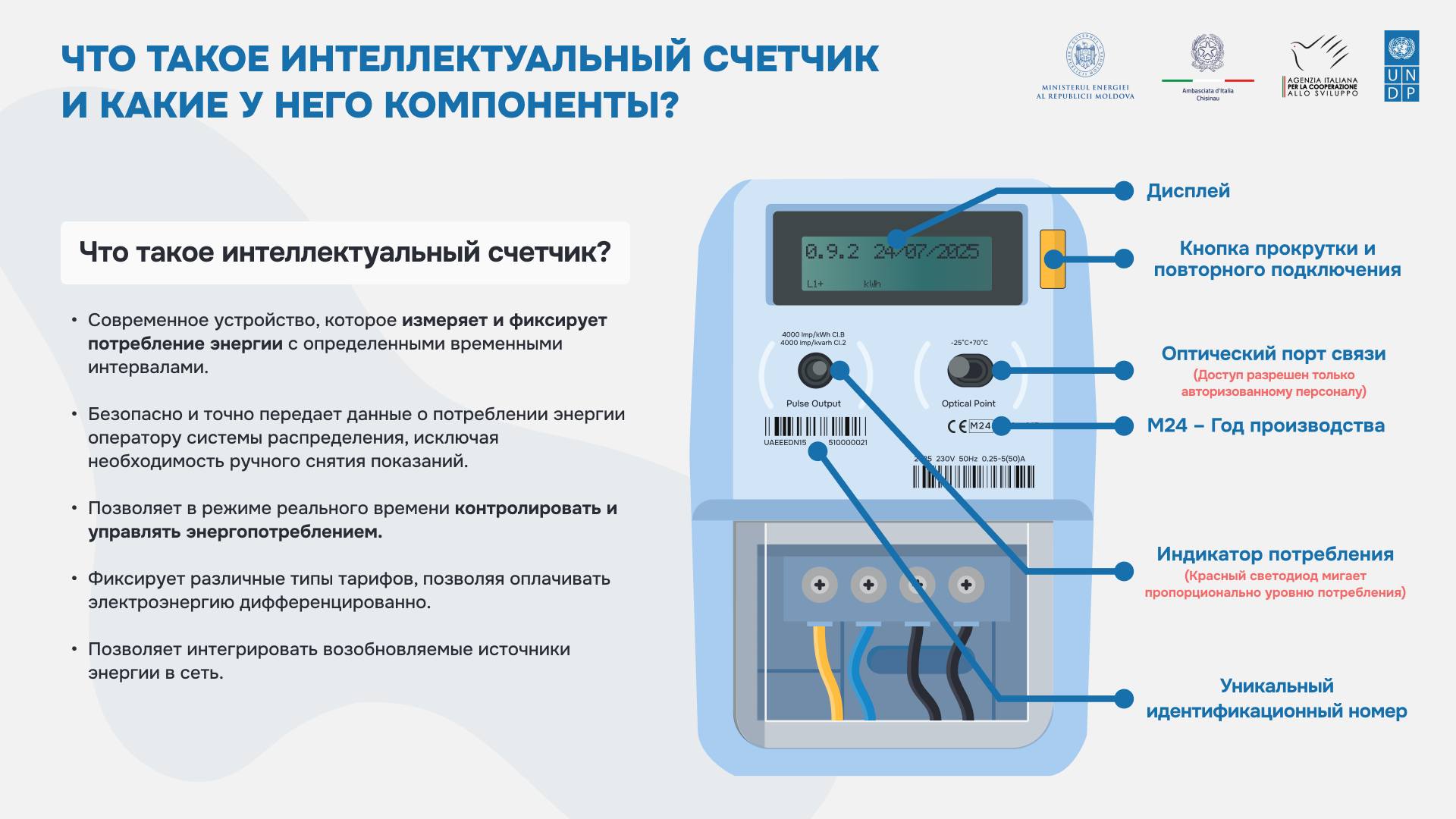 В настоящее время Министерство энергетики реализует пилотный проект по внедрению интеллектуального учета электроэнергии, при поддержке ПРООН в Молдове и финансировании Правительства Италии. До 2027 года 60 000 домохозяйств будут оснащены интеллектуальными счетчиками, что составит 4,3% от общего количества потребителей электроэнергии (1,4 миллиона).